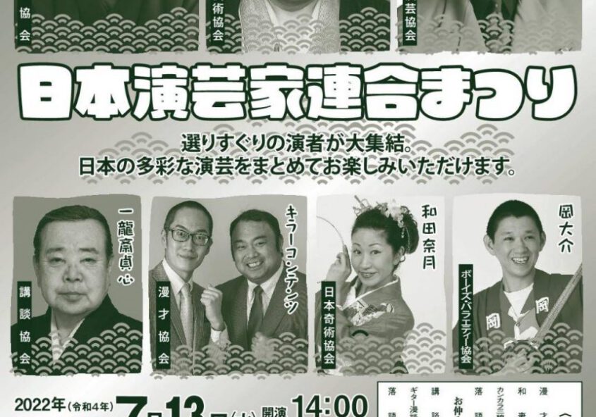 横浜にぎわい座にて「日本演芸家連合まつり」が開催されます! 選りすぐりの演者が大集合。 日本の多彩な演芸をまとめてお楽しみいただけます。 我が協会からは協会員の岡大介が出演致します。 日時:令和4年7月13日(水)14時…