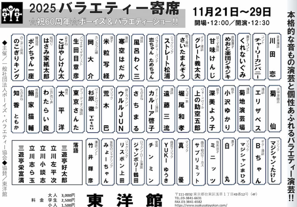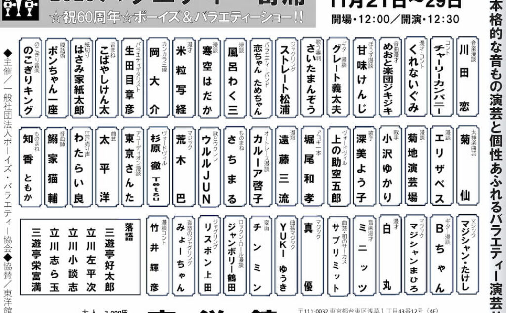 〒111-0032 東京都台東区浅草1-43-12 浅草六区交番前(浅草演芸ホール右隣入口)