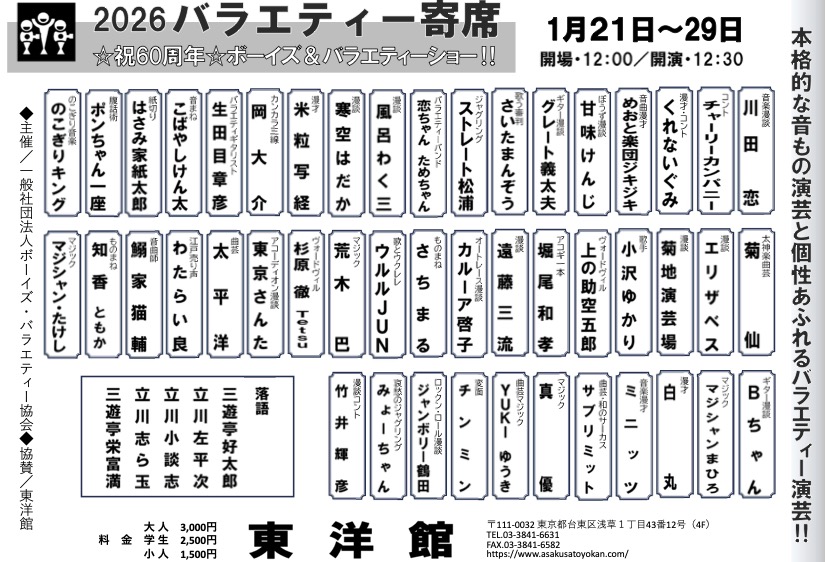 〒111-0032 東京都台東区浅草1-43-12 浅草六区交番前(浅草演芸ホール右隣入口)