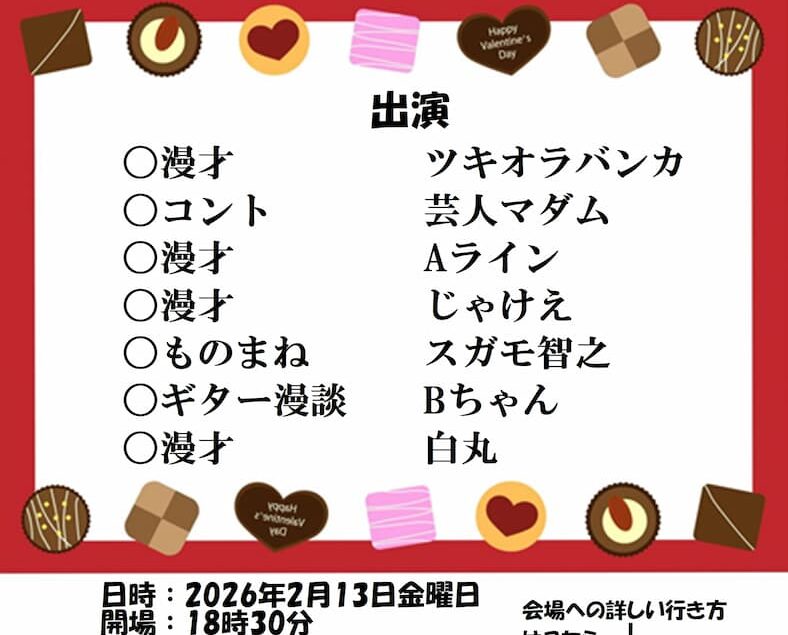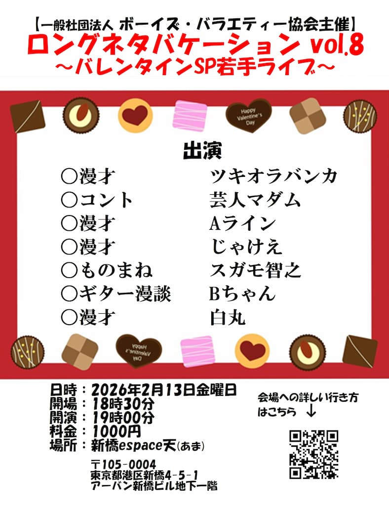 ボーイズ・バラエティー協会主催の「ロングネタバケーション Vol.8〜バレンタインSP若手ライブ〜」を開催します。